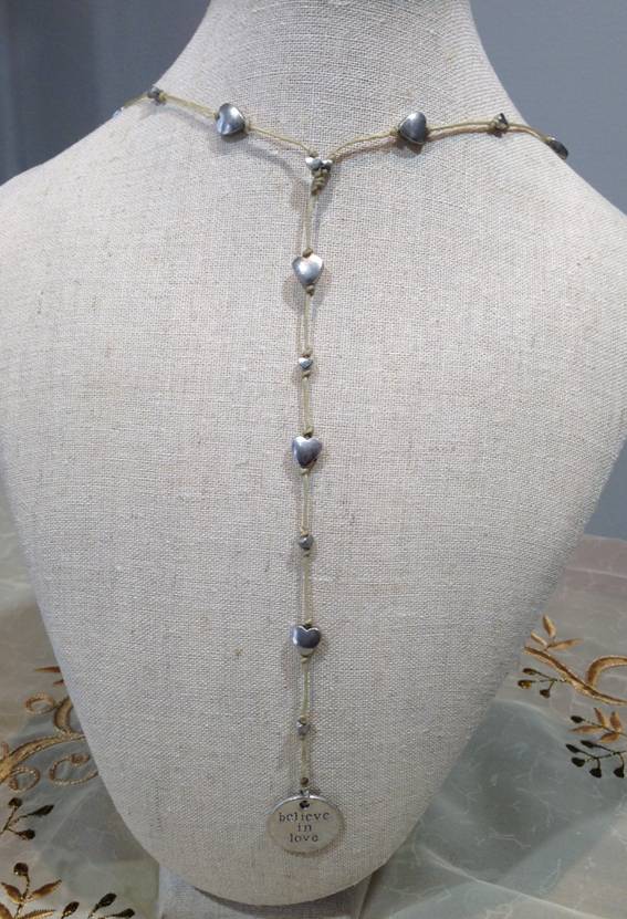 ロウ引きのコットンにハートのパーツが連なるネックレスです。