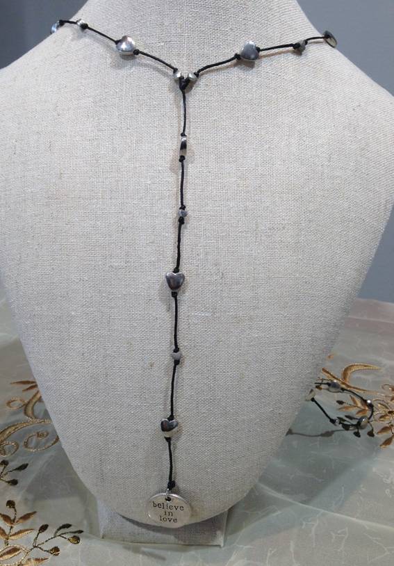 ロウ引きのコットンにハートのパーツが連なるネックレスです。